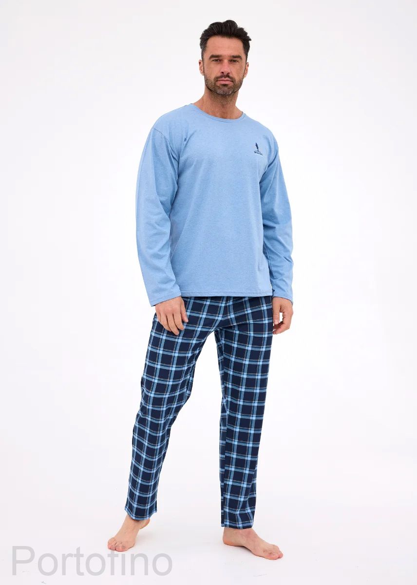 Пижама мужская Cornette 124-308 — стильный и удобный комплект из натурального хлопка, созданный для комфорта и здорового сна. Верх выполнен в виде джемпера с длинным рукавом и круглым вырезом горловины в нежно-голубом цвете. Брюки прямого кроя украшены клетчатым рисунком в темно-сине-голубой гамме, придающим образу современный и элегантный вид.