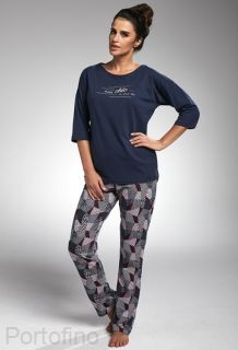 Модная женская пижама от польского производителя Cornette. Пижама выполнена из высококачественного натурального хлопка с добавлением модала, состоит из однотонной кофты темно-синего цвета и брюк серого цвета в оригинальный принт. Кофта с широким вырезом горловины и рукавом 3/4, штаны на мягкой резинке в поясе.