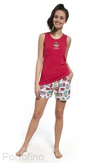 Пижама молодежная из высококачественного хлопка. Сорочка на широких бретелях, спереди украшена цветным рисунком. В комплект с рисунком шорты с карманами.