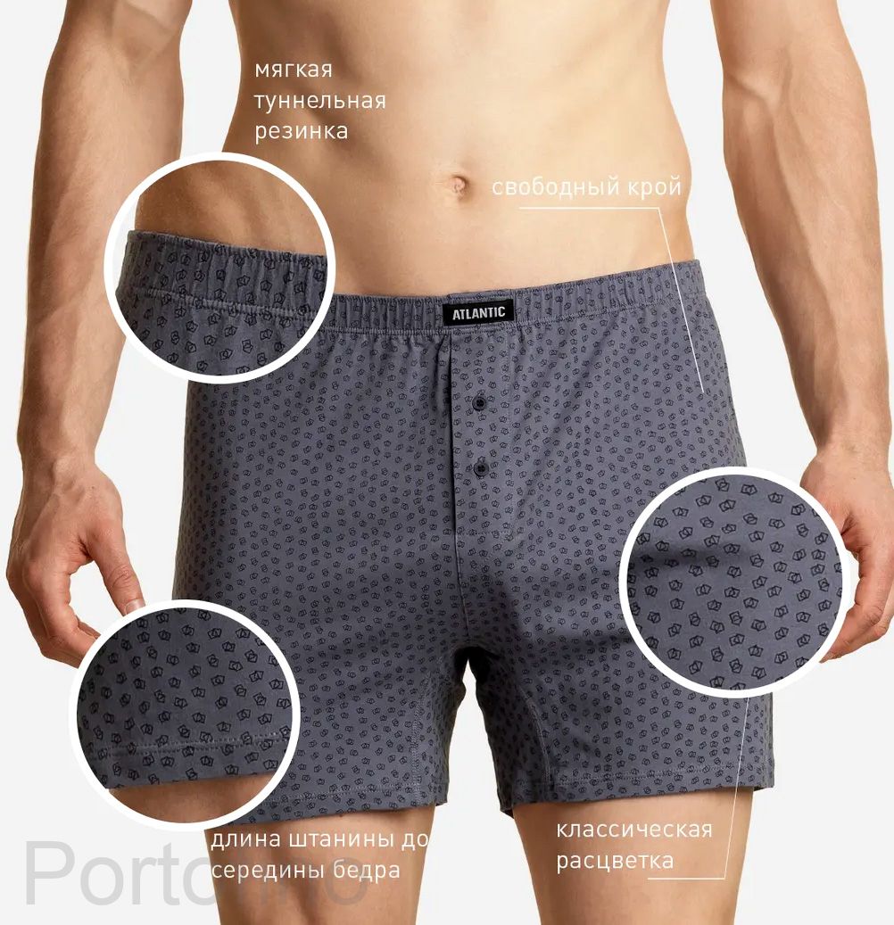 Набор из 2 шт. мужских трусов-боксеров Atlantic серого и черного цвета. Мужские трусы-боксеры 2MBX-013/06 от польского бренда Atlantic на каждый день: превосходно подойдут абсолютно любому мужчине как для повседневной носки, так и для занятий спортом. Классический свободный крой этой модели гарантирует идеальную посадку по фигуре, свободу движений и максимальный комфорт. Скрытая туннельная резинка не давит и не натирает при носке, а также обеспечивает контакт только с натуральным материалом. Свободные мужские боксеры имеют стандартную линию талии и штанины, доходящие до середины бедра, поэтому могут подойти к классическим брюкам или джинсам. В составе мужских семейных трусов используется мягкий, приятный на ощупь 100% хлопок. Трикотажное хлопковое полотно является прочным материалом, устойчивым к высоким температурам и растяжению, благодаря чему нижнее белье надолго сохраняет свой внешний вид и потребительские свойства. В упаковке представлено двое мужских боксерок в следующих расцветках: серый и черный с мелким графическим абстрактным принтом в классическом стиле. Нижнее белье Атлантик будет превосходным подарком для мужчин всех возрастов: молодым парням и подросткам подойдут модели нижнего белья в яркой цветовой гамме и с паттерном или рисунком, более взрослым мужчинам - нижнее белье в сдержанных или строгих цветах, хотя иногда можно нарушить правила и поэкспериментировать. Кроме того, в нашем интернет-магазине Вы сможете приобрести трусы боксеры Атлантик 2MBX-013/06 из наличия по самым выгодным ценам. Широкая размерная сетка с самыми популярными (от S до XXL) и большими (3XL, 4XL) размерами, а также стильная фирменная упаковка нашего нижнего белья помогут однозначно сделать Вам верный выбор!