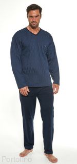 Пижама хлопковая для мужчин производство Польша. Домашний комплект состоит из футболки с длинным рукавом в мелкий геометрический рисунок, в образный вырез горловины. комфортные брюки на широкой резинке однотонные, прямого кроя