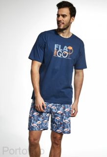 Стильная мужская пижама состоящая из футболки с коротким рукавом и хлопковых шорт. Домашний комплект выполнен в стилистическом оформлении Фламинго. Новая коллекция весна 2019 года.
