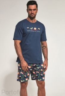 Пижама мужская Sushi от польского бренда Cornette. Пижама выполнена из качественного и натурального хлопка джинсового цвета, состоит из однотонной футболки и прямых шорт в разноцветный рисунок суши. Футболка с круглым вырезом горла и короткими рукавами, шорты с мягкой резинкой в поясе. На груди по центру футболка украшена рисунком из суши и надписи "keep calm eat sushi". Пижама очень комфортная и удобная, будет замечательным подарком для любимого и близкого человека.