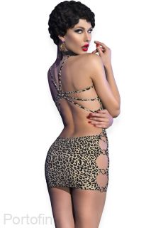 Мини платье арт. 4487 с глубоким декольте и открытой спиной из струящейся ткани с хищным принтом, тонкие бретели на спинке собраны на металлическое кольцо, по бокам вырезы соединены кольцами. Комплектуется стрингами.