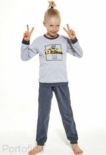 Стильная домашняя пижама для мальчиков из качественного хлопкового полотна с рисунком гоночный автомобиль. Брюки однотонные на манжетах снизу в темно-сером цвете.