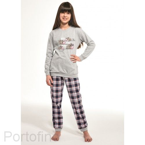 Стильная пижамка из хлопка для девочек. Футболка с длинным рукавом и рисунком панды. Брюки в крупную клетку.