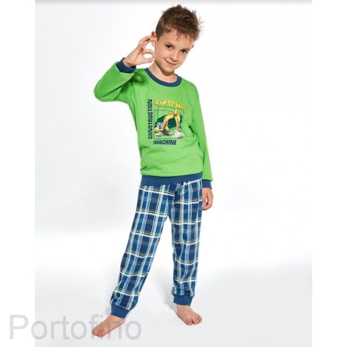 Качественная пижама для мальчиков из мягкого хлопка. Футболка с длинным рукавом с рисунком экскаватор и брюки в крупную клетку. Отличный вариант для домашнего отдыха.