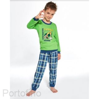Футболка с длинным рукавом с рисунком экскаватор и брюки в крупную клетку.