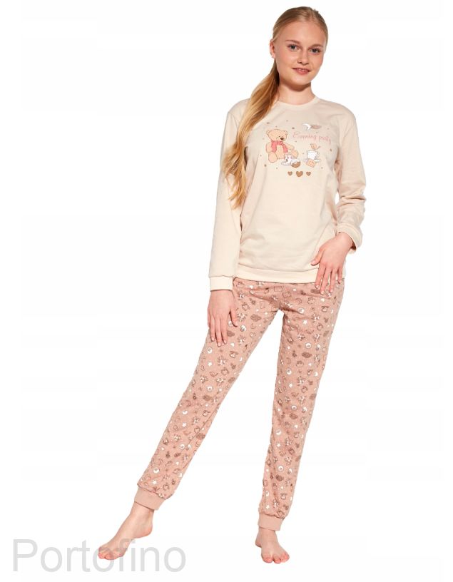 Очаровательная детская пижама из коллекции Evening от польского бренда Cornette создана для максимального комфорта вашего ребенка. Модель выполнена в нежном бежевом цвете с милым принтом мишки с чашкой кофе на кофте и очаровательными зимними мотивами на штанишках.