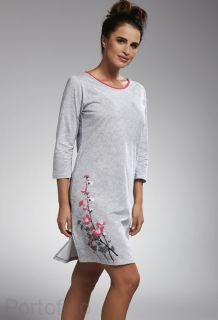 Стильная женская ночная сорочка от ТМ Cornette. Сорочка выполнена из натурального и высококачественного хлопка серого цвета в мелкий рисунок, длина до колен, с рукавами 3/4 и округлым вырезом горла, по бокам небольшие разрезы. Округлый вырез обработан кантом красного цвета, внизу справа оригинальный рисунок "веточка цветущей вишни".