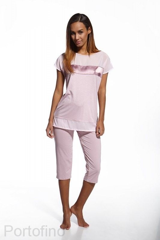 Пижама из мягкой вискозы идеально подойдет для сна и отдыха в прохладное и теплое время года. Футболка с коротким рукавом с атласной вставкой в тон кофты, штаны однотонные 3/4. Из коллекции Dream, расцветка в пастельных тонах.