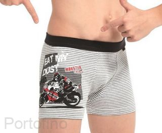 Трусы для мальчиков из хлопкового полотна в горизонтальную полоску с рисунком мотоцикл.