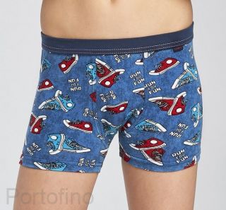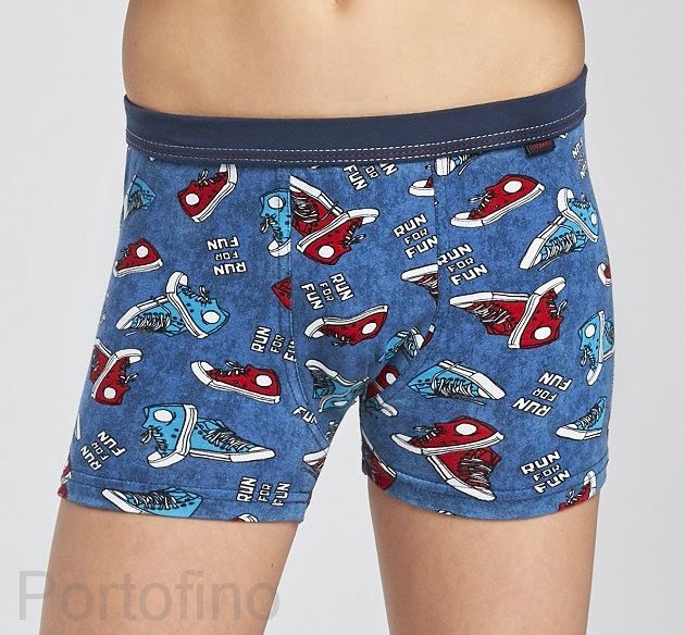 Прикольная модель трусов для мальчика синего цвета с рисунком кеды.