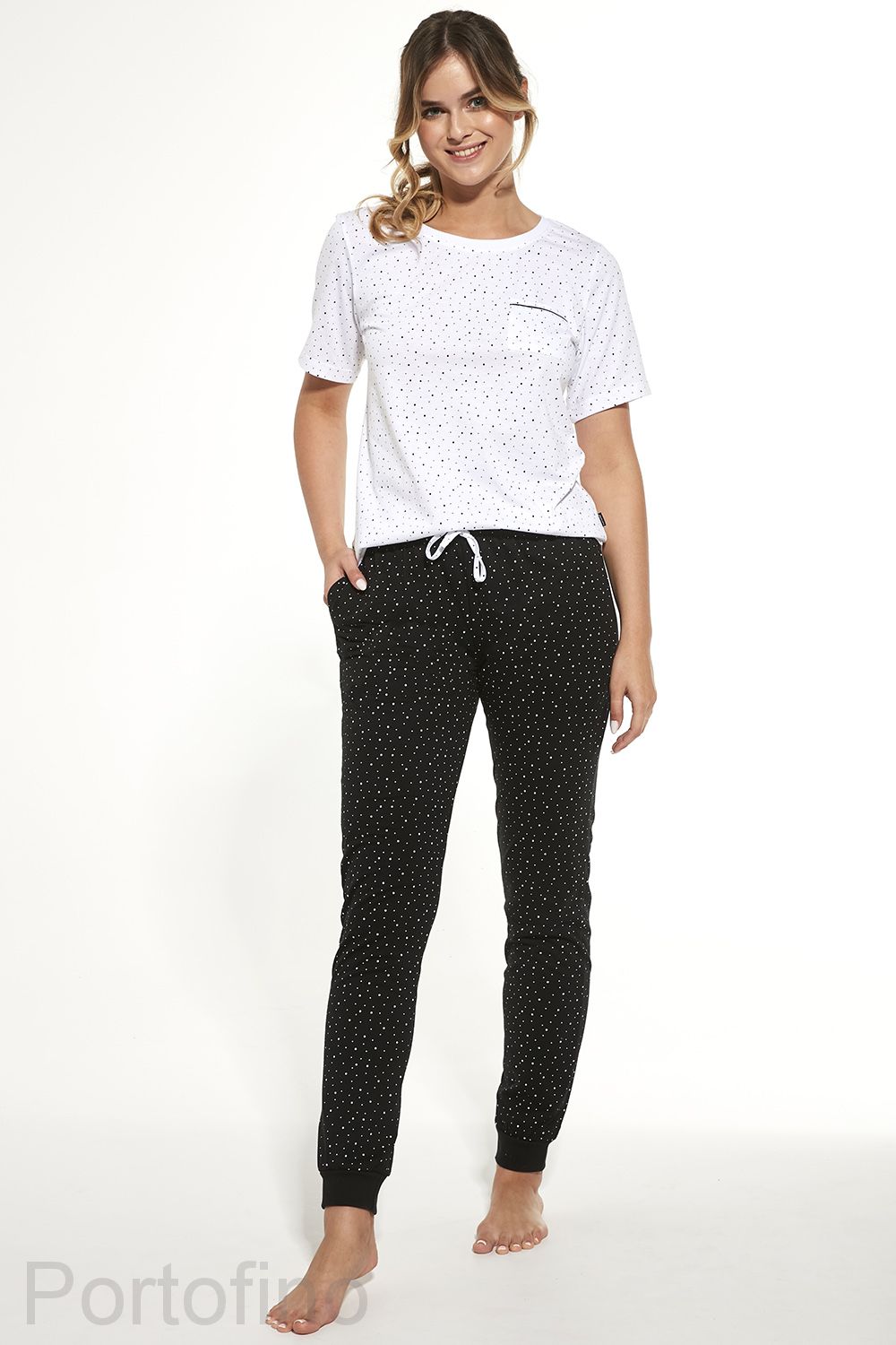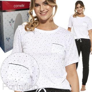 Пижама женская для домашнего отдыха, комплект состоит из футболки с кротким рукавом и интересных брюк с мелкий горошек. Упаковано в красивую упаковку для подарка. Высокое качество хлопка и идеальный домашний комфорт на весь день.