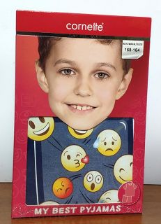 Детская пижама для мальчика Emoticon от Cornette. Пижама выполнена из качественного и мягкого хлопка, состоит из футболки джинсового цвета и черных шорт в разноцветные смайлики. Футболка с круглым вырезом горла и с короткими рукавами, шорты на мягкой резинке в поясе.