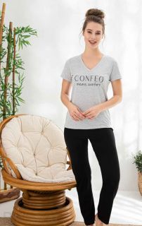 Стильная и очень удобная пижама из мягкого хлопка. Домашний комплект из футболки с коротким рукавом в сером цвете и однотонные черные брюки. Замечательная одежда для дома от ведущего турецкого производителя