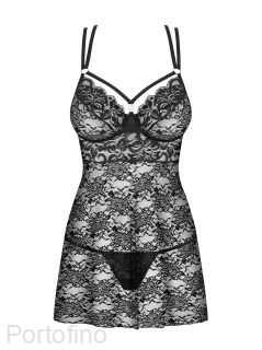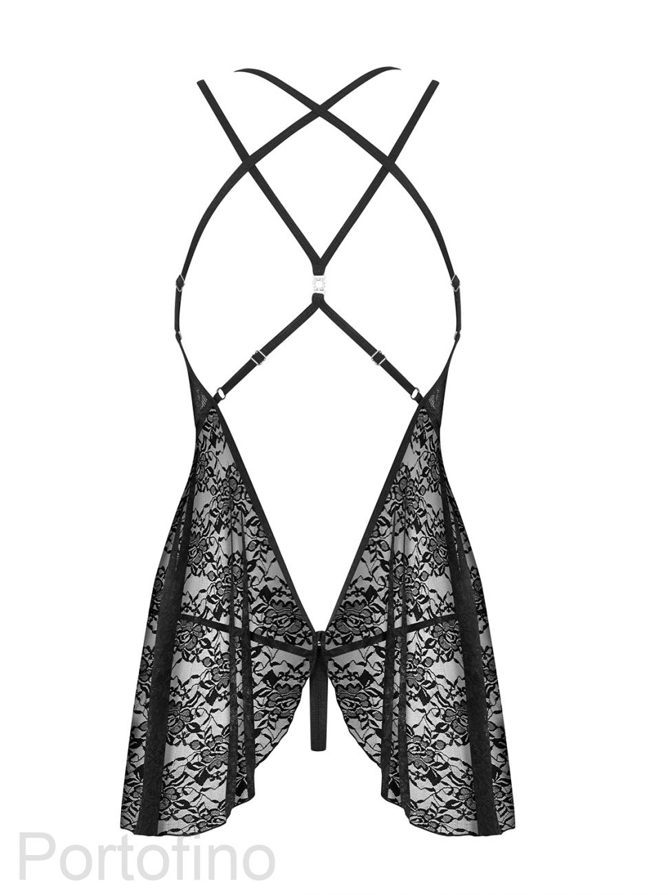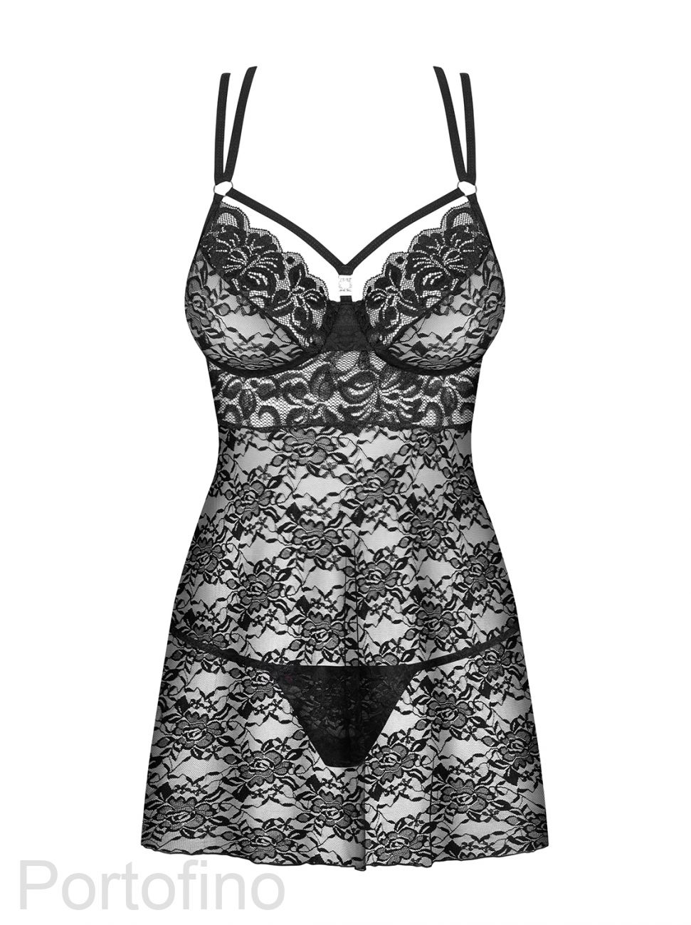Сорочка бебидолл из коллекции 860 из прозрачного гипюра с цветочным рисунком, лиф мягкий, на косточках, тонкие бретельки регулируются по длине, на спине перекрещиваются. Вырез на спине, частично открывает ягодицы. Сорочка комплектуется трусиками стрингами.