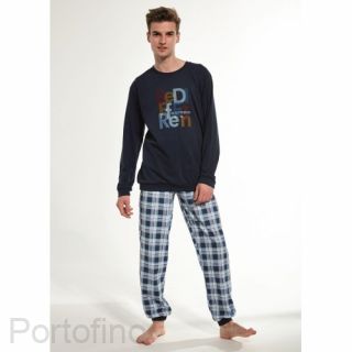 Футболка с длинным рукавом и модным рисунком, брюки с геометрическим рисунком в клетку.