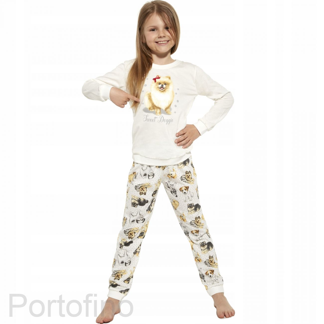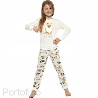 Пижама для девочек из качественного хлопкового полотна. Отличный комплект для домашнего отдыха или комфортного сна. Комплект состоит из футболки с длинным рукавом в молочном цвете с рисунком собачка, и красивые брюки с манжетой внизу, с мелким рисунком собачки. Пижама упакована в красивую подарочную упаковку для нужного и полезного подарка на новый год.