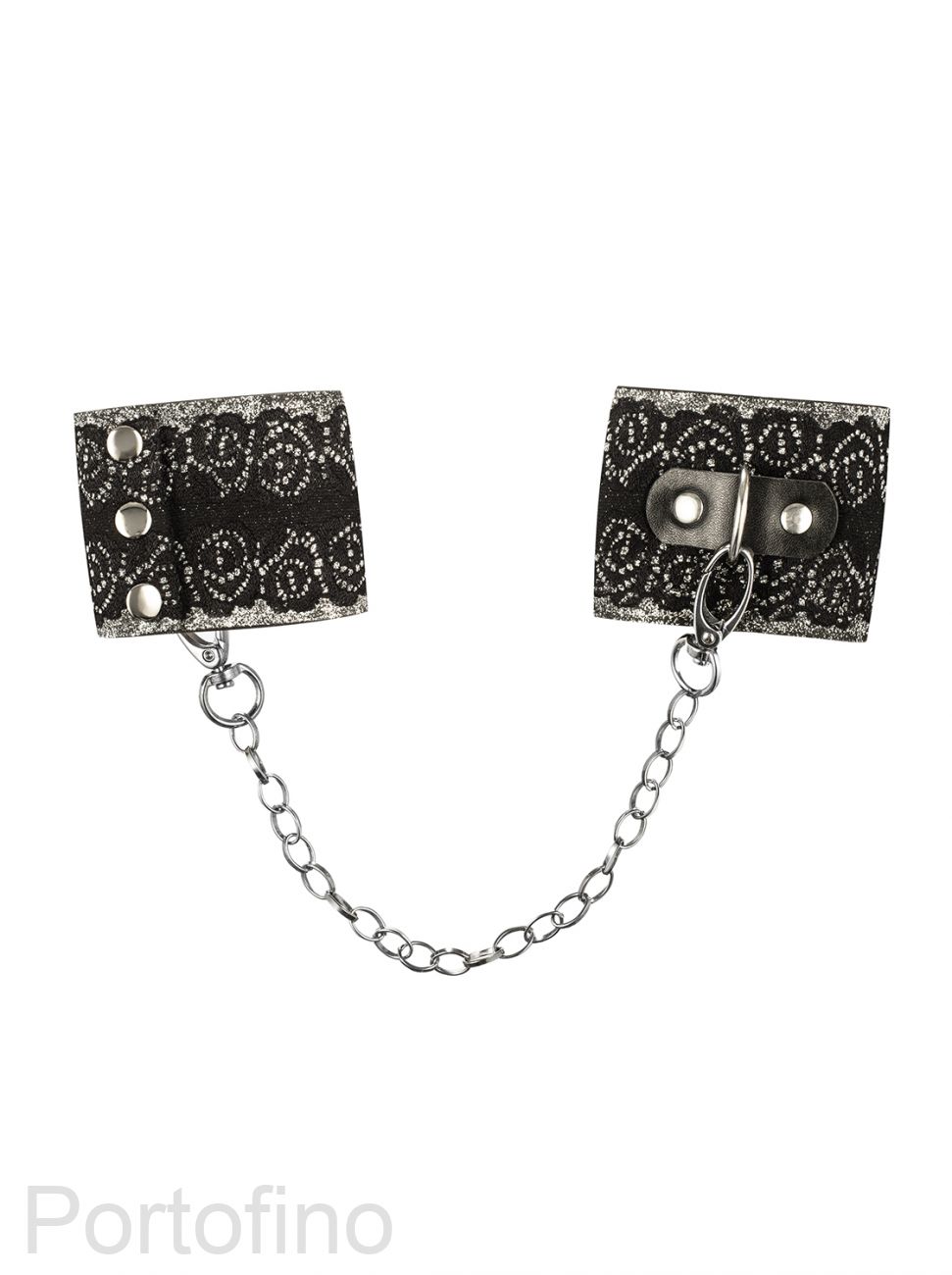 Наручники для эротических игр A747, декорированы черным кружевом поверх материала с блестками, соединены съёмной цепочкой, застёгиваются на 3 кнопки.