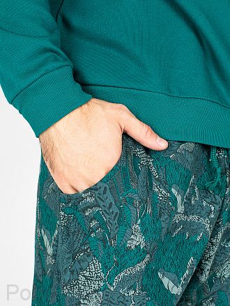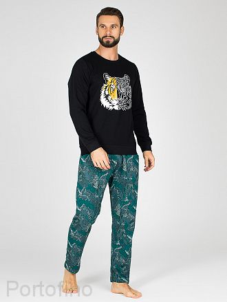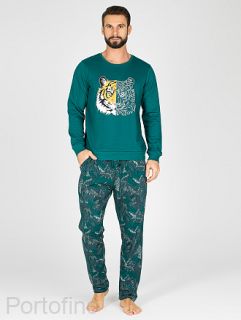 Домашний мужской комплект из хлопкового футера состоит из свитшота и брюк на широкой поясной резинке с внутренним утягивающим шнурком. Боковые карманы с отрезным бочком. Круглый вырез горловины обработан кантом-резинкой. Нижний край рукава и низ свитшота на широкой манжетной резинке.