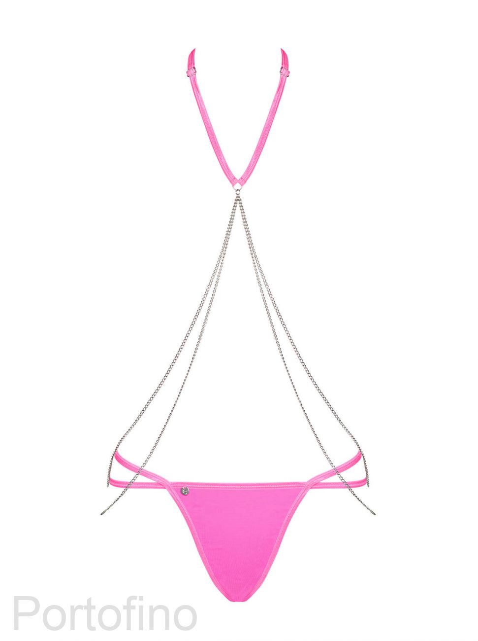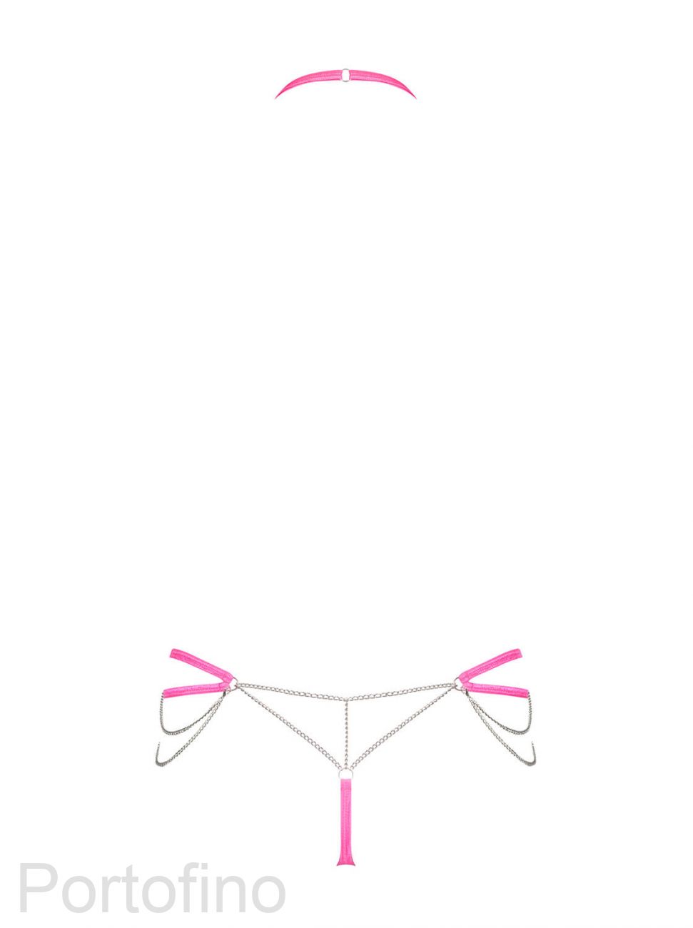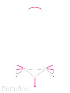Комплект из серии Chainty: Трусики стринг неоново-розового цвета, на спинке из цепочек, к стрингам крепится съёмный аксессуар-тонкий ремешок на шею регулируемый по длине, с цепочками, которые красиво подчеркнут грудь и бедра.