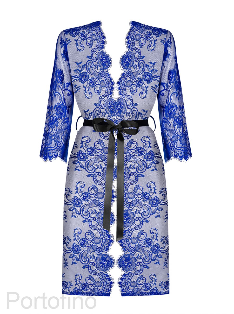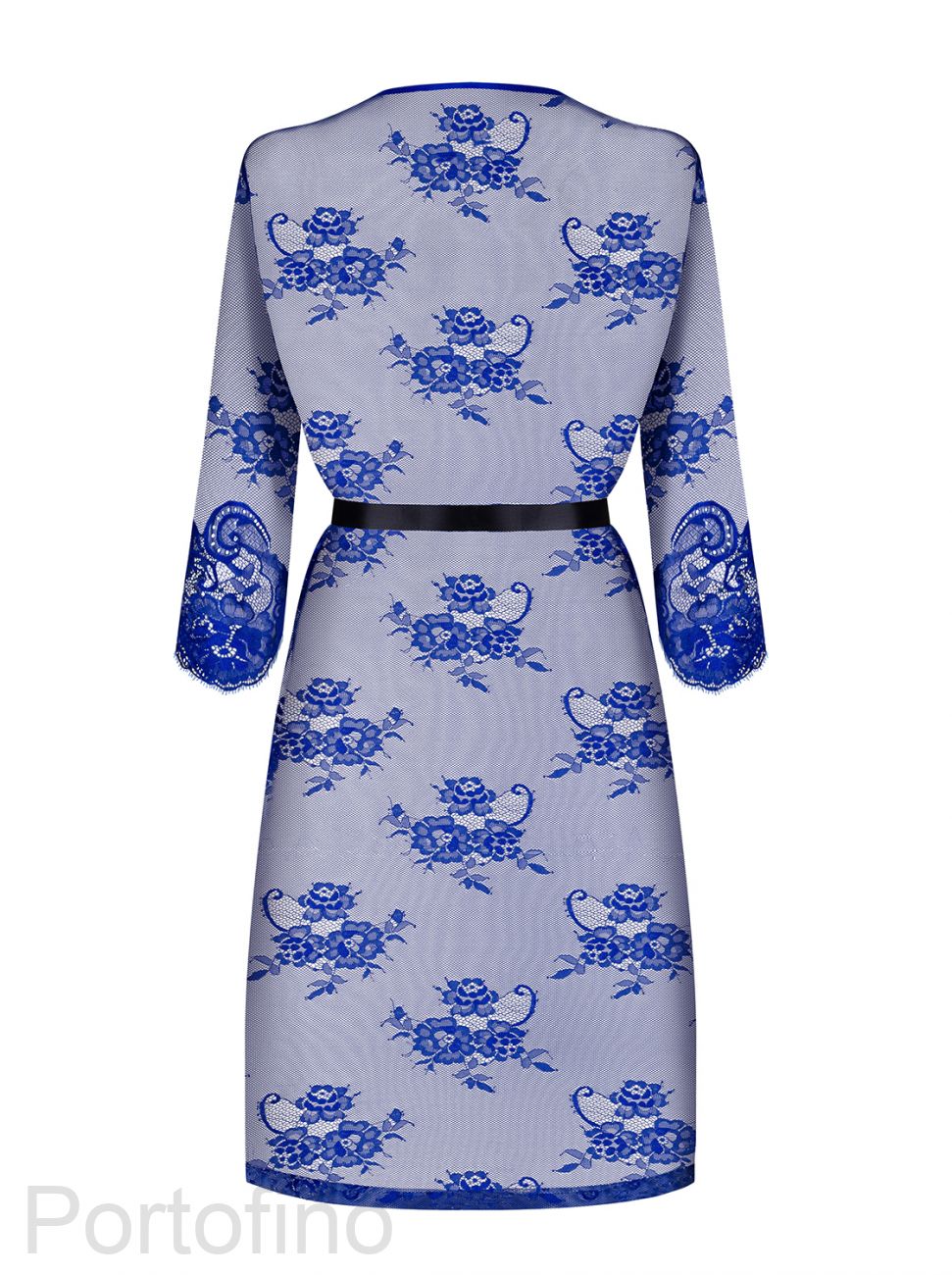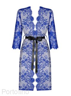 Восхитительный длинный пеньюар из коллекции Cobaltess из прозрачного кружева цвета кобальта с цветочным рисунком, на талии пояс из черной атласной ленты, рукава 3/4.