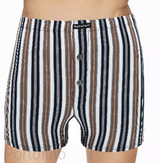 Основной декоративный элемент модели — тонкая вертикальная полоска в сочетании глубоких синих и благородных коричневых оттенков на белом фоне. Такой дизайн выглядит элегантно и универсально, позволяя сочетать трусы с любыми домашними образами. Длина до середины бедра обеспечивает оптимальную вентиляцию и свободу движений, что делает эту модель незаменимой для ежедневной носки.