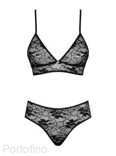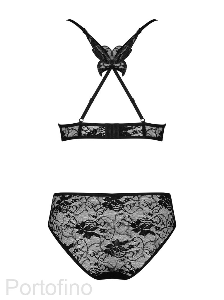 Комплект белья из серии Kokietta из гипюра с цветочным рисунком: бюстгальтер без косточек, тонкие бретельки регулируются по длине, на спине застежка-удлинитель, на бретелях аппликация в виде бабочки. В комплект к бюсту идут трусы панти с высокой линией талии, ластовица из 100% хлопка.