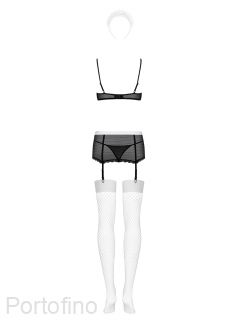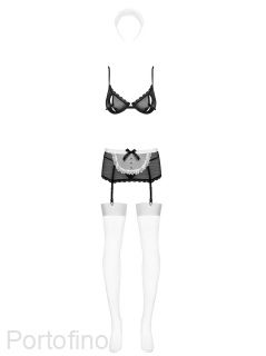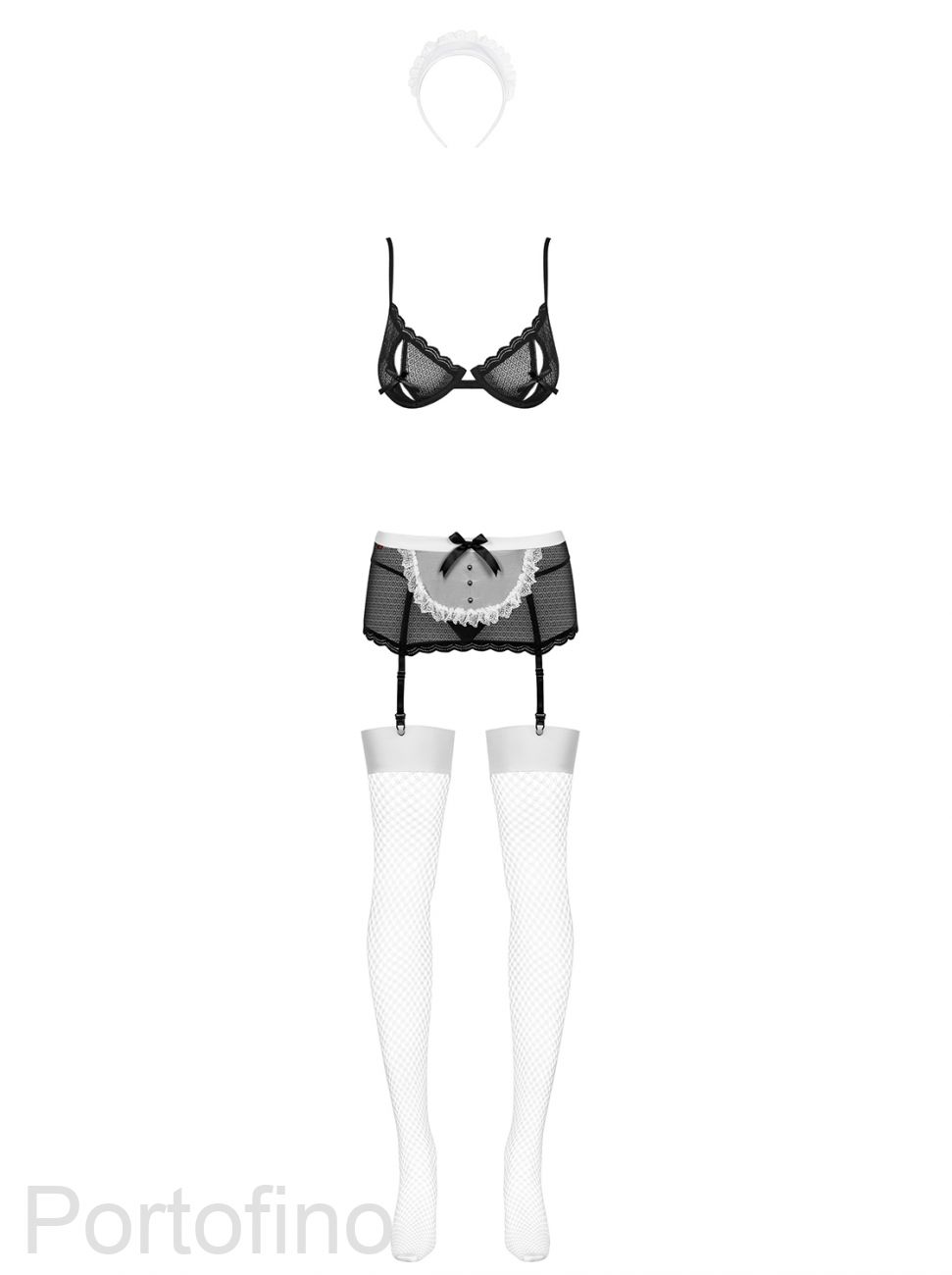 Комплект эротического белья Maidme, «сексуальное обслуживание» из пяти предметов, выполнен из эластичной чёрной ткани с рисунком «ромбики».Бюстгальтер с мягкими чашечками на косточках, с вертикальными разрезами, скреплёнными завязками, бретельки регулируются по длине, на спине застёжка-удлинитель.Широкий пояс для чулок, стилизованный под фартук, усилен продольными эластичными швами, к подолу крепятся пажи для чулок. Комплект дополняют: белый чепец на ободке, чёрные трусики стринги и белые чулки сеточки.