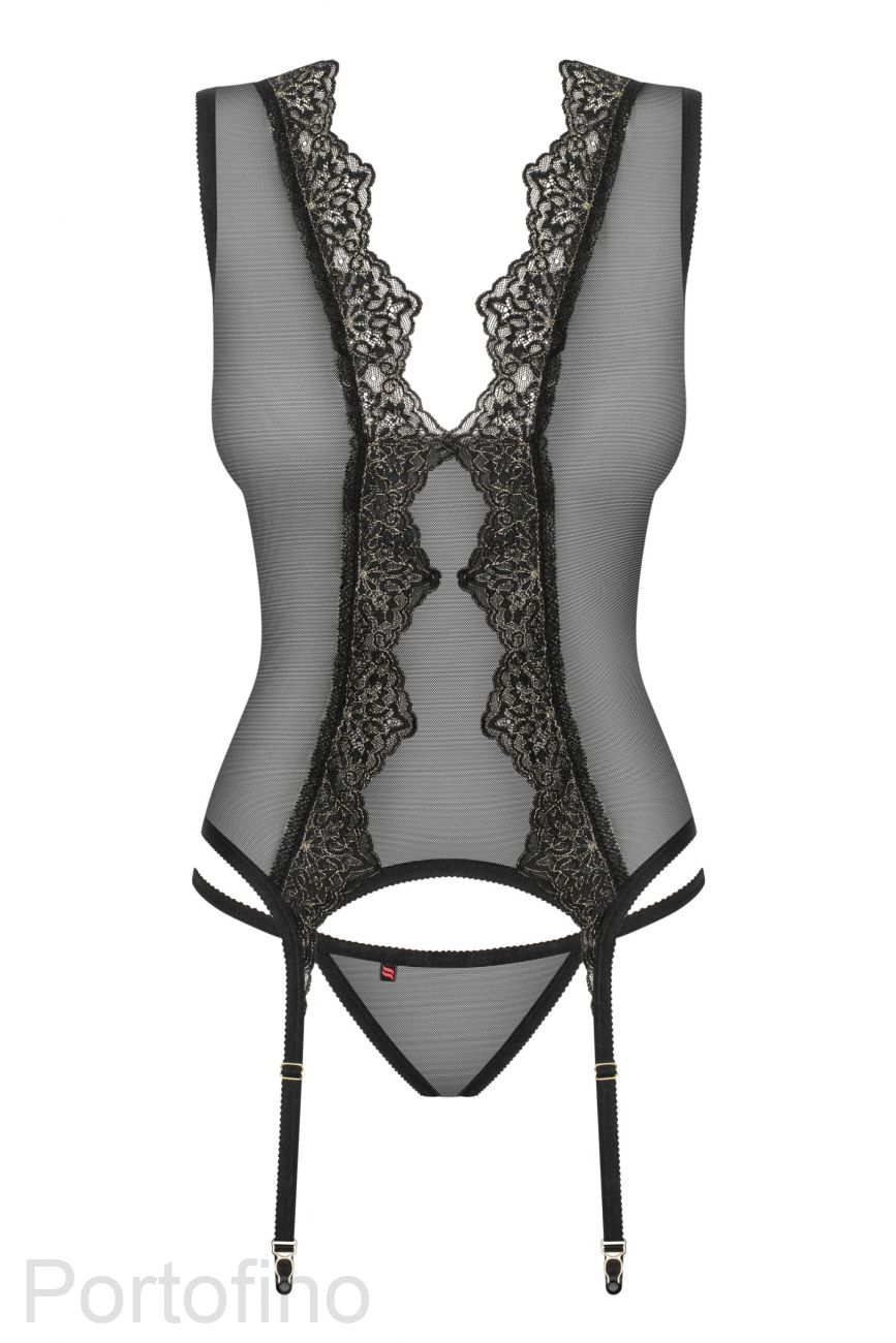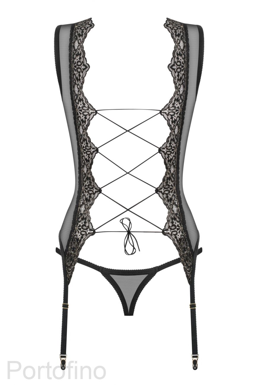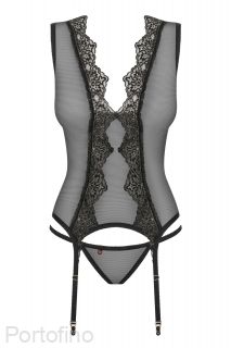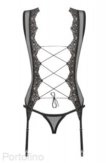 Корсет из коллекции Meshlove создан из эластичной прозрачной вуали и кружева с цветной нитью, на спине корректирующая размер шнуровка, пажи для чулок регулируются по длине. Корсет комплектуется стрингами.