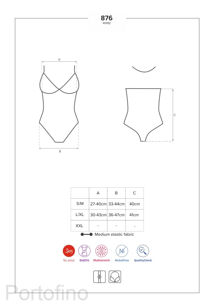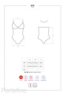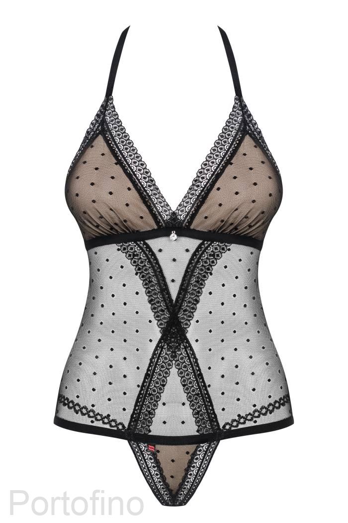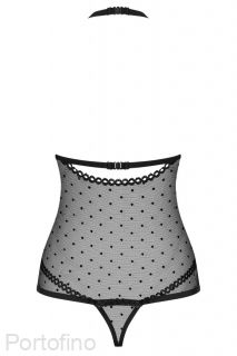 Боди стринг из коллекции 876 из прозрачной вуали с рисунком "точки", лиф мягкий, продублирован телесной тканью, тонкие бретели застёгиваются сзади на шее и спинке. Спереди полосы кружева перекрещиваются, визуально вытягивая силуэт.