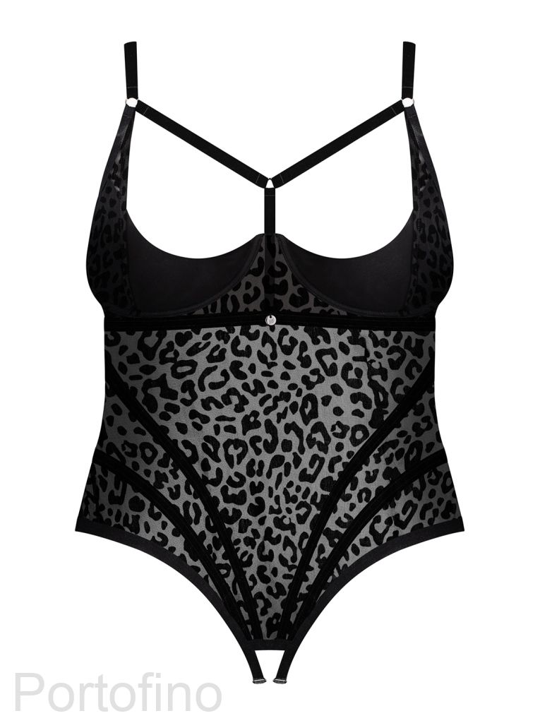 Боди с открытой ластовицей из коллекции Jagueria из прозрачной вуали с хищным принтом флоком, боетели и резинки бархатные. Чашечки открытые, на косточках, на тонком поролоне, с дополнительными боковыми поддержками, бретельки регулируются по длине, на спине застёжка-удлинитель на крючках. В зоне ластовицы тонкие эластичные союзки, регулируемые по длине.