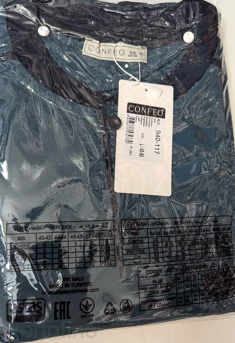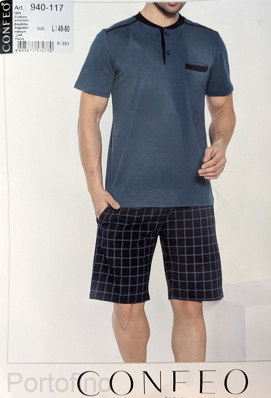 Мужская пижама CONFEO С940-117 создана для комфортного отдыха и качественного сна. Верхняя часть выполнена из 100% хлопка плотностью 160 г/м² в благородном серо-голубом оттенке. Модель оснащена коротким рукавом, круглым вырезом и планкой на двух кнопках с контрастным кантом, что придаёт пижаме утончённый вид и позволяет регулировать вентиляцию в тёплые ночи.