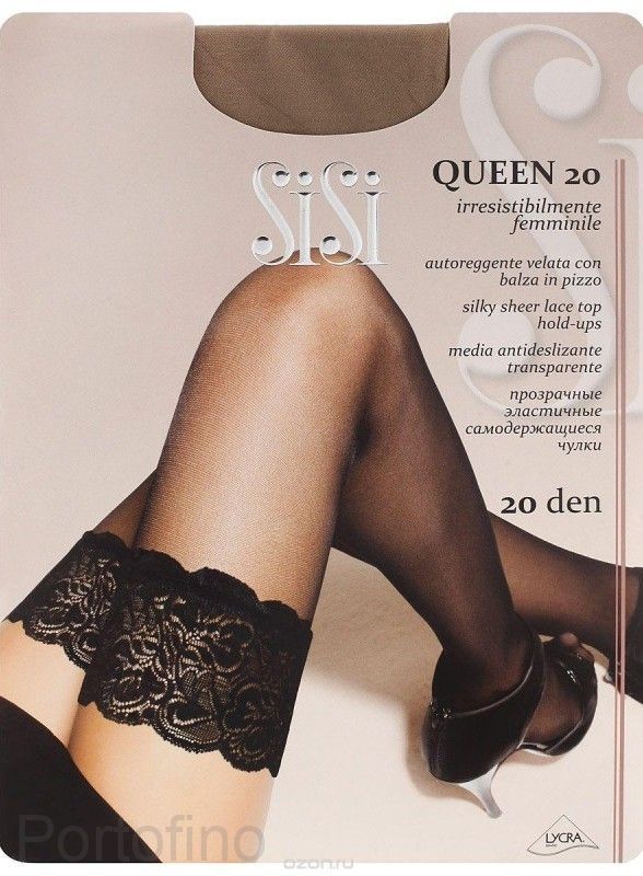 Чулки женские матовые Sisi Queen 20 плотностью 20 ден, с лайкрой, с кружевной блестящей резинкой на силиконовой основе шириной 7 см, с усиленным носком, формованные.