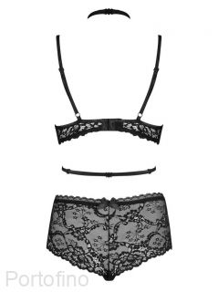 Комплект белья из серии Raquelia из кружева с цветочным орнаментом: бюстгальтер мягкий, на косточках, тонкие бретельки регулируются по длине, на спине застежка. В комплект к бюсту идут высокие кружевные трусики шорты и колье с застежками на шее и спине.