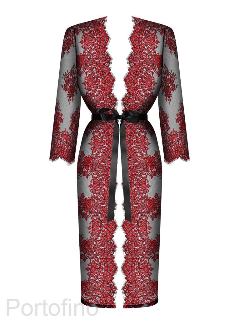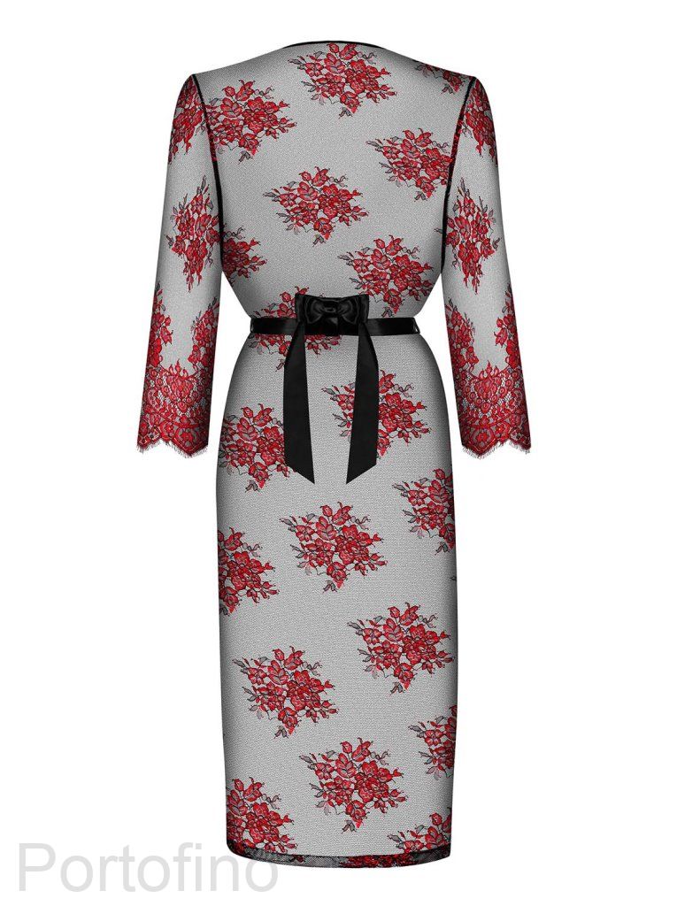 Восхитительный длинный пеньюар из коллекции Redessia из прозрачного черного кружева с красным цветочным рисунком, на спинке пришит бант из атласной ленты, рукава длинные, края с ресничками. Пояс из атласной ленты в комплекте.