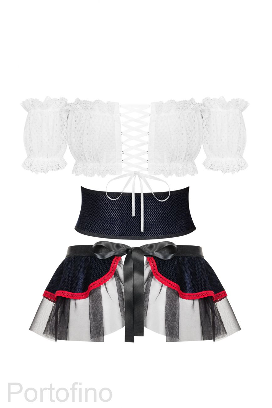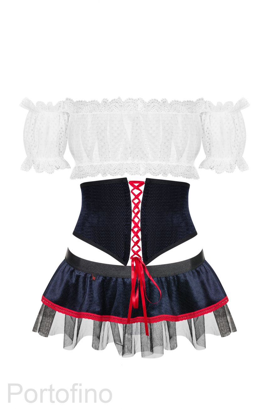 Костюм для ролевых игр Slaviana Девушка славянка состоит из 5 предметов:Топ-бандо короткий кружевной, с вертикальными косточками, на спине шнуровка Короткие рукавчики Мини юбочка-передник на резинке двойная - нижняя юбочка из чёрной сетки, верхняя из синего велюра, украшена узким красным кружевом, на спине бант из атласных лент Короткий полукорсет на талии, с вертикальными косточками, с корректирующей размер шнуровкой спереди Белые стринги завершают наряд.